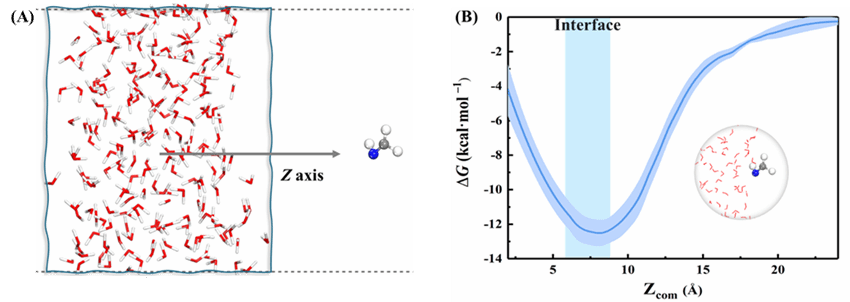 空气−水界面以各种形式存在于大气中,这在大气化学中起着重要作用。最近的研究表明,与气相和水相相比,在空气−水界面的反应机制和反应速率会有所不同。这种独特的现象是由氢键网络的形成以及在空气−水界面处存在强电场(~ 109V/m)所引起的。亚胺由于具有两亲性,可能在空气−水界面富集。因此,空气−水界面应是大气亚胺水解的关键环境介质,有必要研究亚胺在空气−水界面的水解机制和动力学。