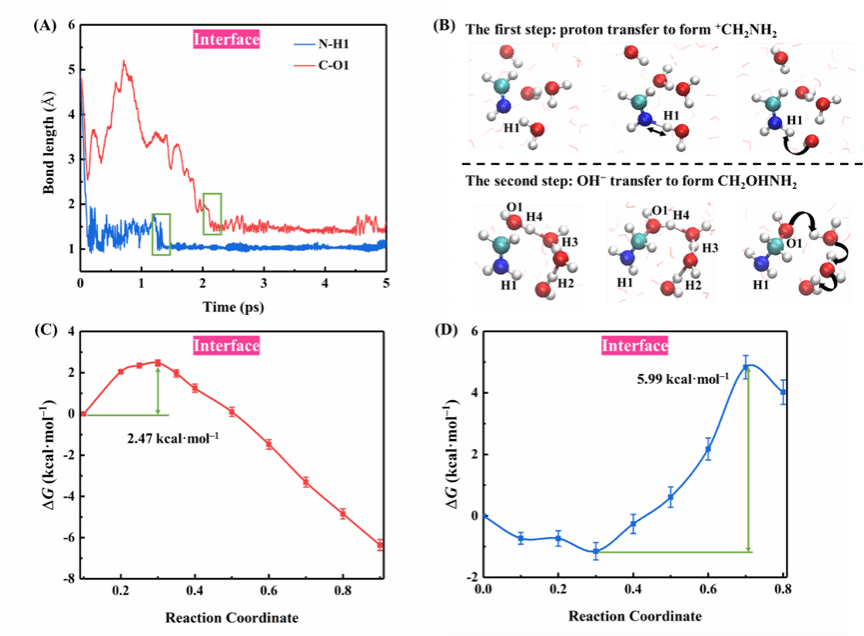 图4 CH2NH在空气−水界面水解过程中的关键键长随模拟时间的变化图(A),MTD模拟反应的快照图(B),水解反应的第一步(C)和第二步(D)的自由能曲线图
