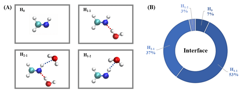 图3 CH2NH在空气−水界面的氢键构型图(A)和构型分布概率图(B)