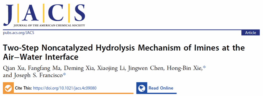 近日,大连理工大学环境学院谢宏彬教授在化学领域权威期刊Journal of the American Chemical Society上发表了题为“Two-Step Noncatalyzed Hydrolysis Mechanism of Imines at the Air−Water Interface”的研究论文。该论文采用先进的Born-Oppenheimer分子动力学(BOMD)方法,模拟了甲亚胺(CH2NH)在空气−水界面的非催化水解反应机制及动力学,阐明甲亚胺在空气水界面水解可行,提出了独特的非催化两步水解机制,突破早期有机化学书认为的酸催化水解机制。两步非催化水解机制具有重大的环境意义,由于在真实的大气水环境中存在许多伴生离子,其他离子可能会介导两步水解过程,从而生成新的化合物或污染物,贡献颗粒物的增长。
