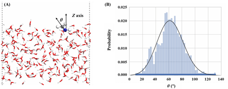 图2 CH2NH在空气−水界面吸附结构θ角的定义示意图(A)和θ角分布图(B)