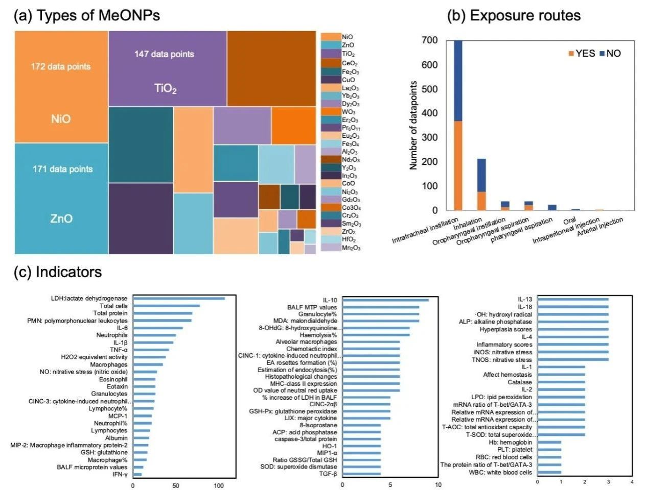 图2 数据集概览。(a)纳米金属氧化物的化学组成。色块的面积表示数据点的数量。(b)动物实验中的暴露途径。(c)体内肺毒性的毒理学生物指标。