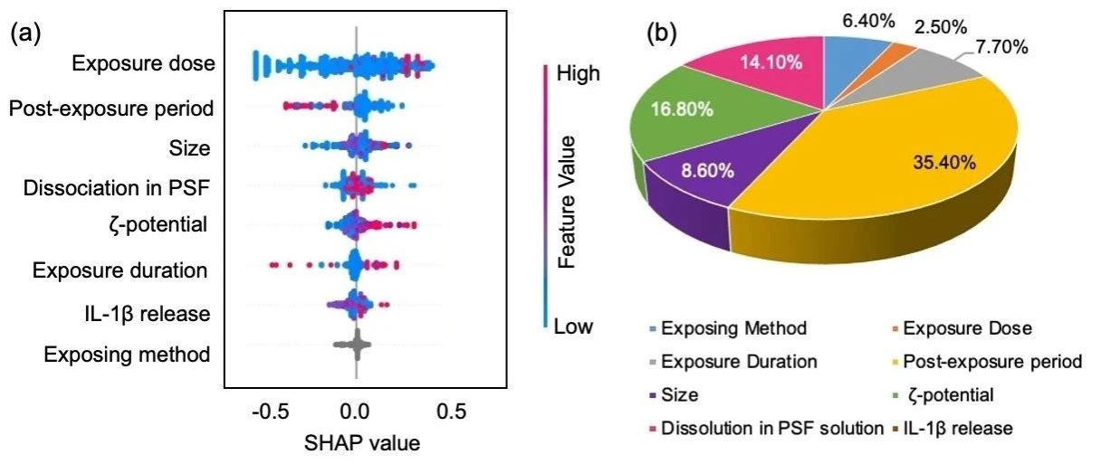 借助机器学习算法和SHAP方法分析发现,THP-1细胞中的促炎细胞因子IL-1β可以作为预测肺毒性的体外标志物。此外,材料的尺寸、ζ电位、溶解度以及体内测试的暴露条件也是影响纳米金属氧化物肺部毒性的重要因素。通过识别模型的关键参数,进一步揭示了IVIVE毒性外推过程中的涉及的毒性作用机制。