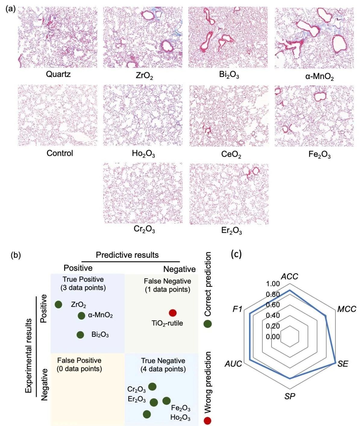 通过测试8种不包含在建模数据集中的纳米金属氧化物诱导32只小鼠产生的慢性肺纤维化水平,构建了实验验证集。实验验证中,模型准确预测了88%的实验结果。