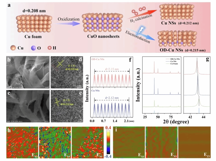 图1:Cu NSs和OD-Cu NSs合成示意图。a Cu NSs和OD-Cu NSs合成示意图。b-e 分别为OD-Cu NSs (b, d)和Cu NSs (c, e)的 SEM图像和HRTEM图像。f Cu NSs和OD-Cu NSs的晶格间距。g XRD图谱。h, i 基于HRTEM图像绘制的OD-Cu NSs (h)和Cu NSs (i)在Exy, Exx和Eyy处的应变场图。