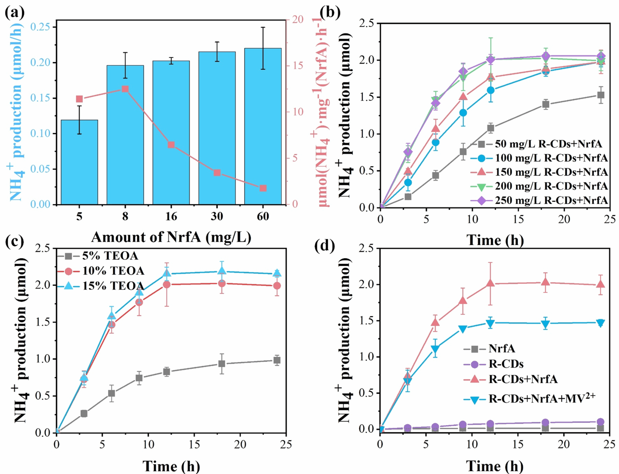 图1 (a) NrfA浓度对光催化系统产NH4+的影响;(b) R-CDs浓度对光催化系统产NH4+的影响;(c) TEOA浓度对光催化系统产NH4+的影响;(d)不同光催化系统的NH4+生产情况