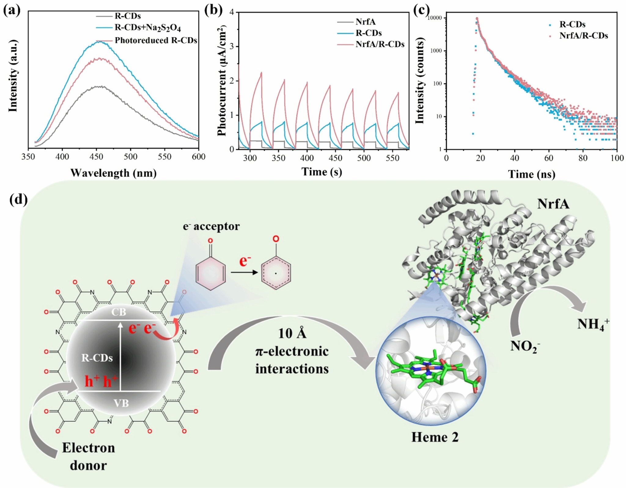图5 (a) R-CDs还原后的荧光强度变化;(b) NrfA/R-CDs的光电流强度;(c)添加NrfA前后的R-CDs的荧光寿命衰减曲线;(d) NrfA与R-CDs之间的直接电子转移机理