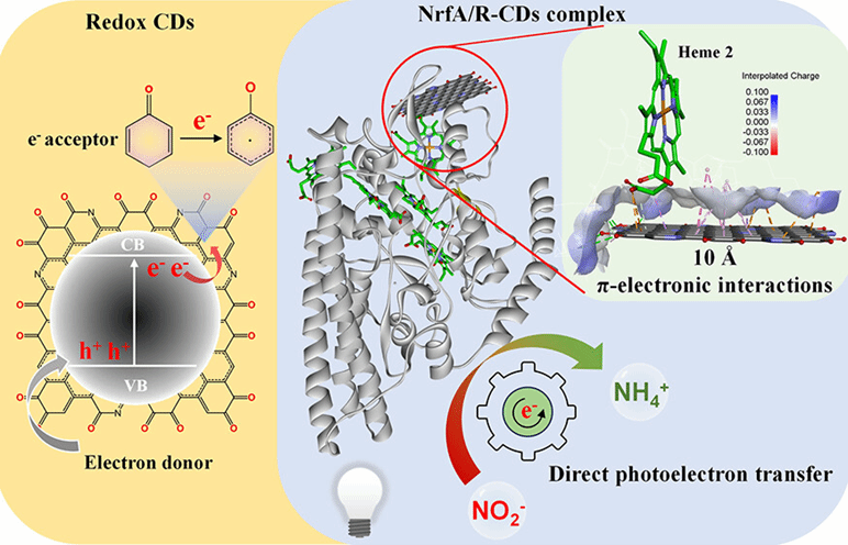 相比哈伯-博世人工合成氨,微生物异化硝酸盐还原成铵(DNRA)具有温和和选择性高的特点。细胞色素c亚硝酸还原酶(NrfA)作为DNRA过程的限速酶,可催化六电子的亚硝酸还原为铵过程。在Shewanella oneidensis MR-1等DNRA细菌中,NrfA通常与膜结合的氧化还原伴侣(CymA)形成复合物,后者从电子传递链中的甲萘醌中获取电子,这种代谢方式涉及多种酶催化。由于微生物电子传递速度较慢,通常导致NH4+ 产量较低。半人工光合作用结合了光催化剂的光吸收能力和酶的生物催化作用。这种方法可以再生NAD(P)H和还原型甲基紫精(MV•+)等辅因子,或直接向酶提供光电子。然而,辅因子与酶活性位点之间的间接电子转移过程和非特异性相互作用往往会导致电子传递效率的损失。可见,直接电子传递过程可获得更高的效率。在前期的研究中,我们发现菌株MR-1和R-CDs组成的全细胞杂合系统中(10.1016/j.biortech.2024.131539),R-CDs被证实可进入菌株MR-1内部,并提供短程光电子转移途径,提高NH4+的产量。