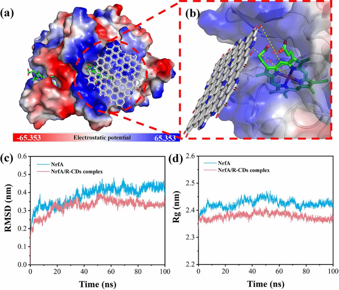 图3 (a, b) NrfA/R-CDs复合物分子对接模型的最佳姿态;(c) MD过程中NrfA和NrfA/R-CDs复合物的RMSD变化;(d) MD过程中NrfA和NrfA/R-CDs复合物的Rg变化