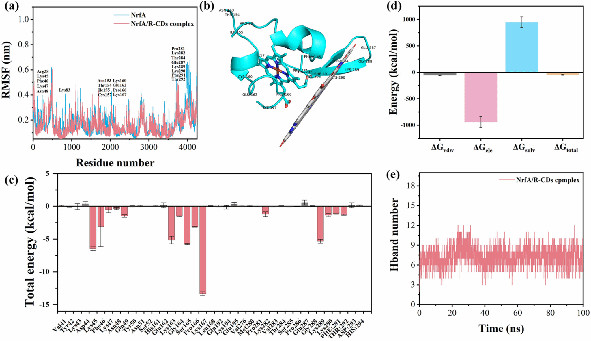 图4 (a) MD过程中NrfA和NrfA/R-CDs复合物的RMSF值;(b) RMSF降低的氨基酸残基可视化;(c) NrfA/R-CDs复合物中氨基酸残基的结合自由能分解;(d) NrfA/R-CDs复合物的结合自由能(ΔGvdw:范德华相互作用能;ΔGele:静电相互作用能;ΔGsolv:溶解能;ΔGtotal:总结合自由能);(e) MD过程中NrfA与R-CDs形成的氢键数量