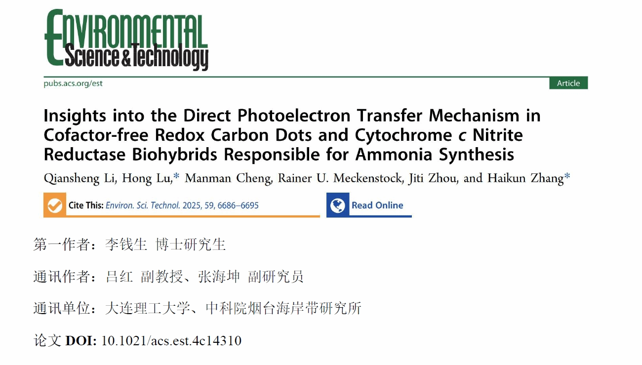 近日,大连理工大学环境学院吕红副教授与中科院烟台海岸带研究所张海坤副研究员合作,在环境领域权威期刊Environmental Science & Technology上发表了题为“Insights into the Direct Photoelectron Transfer Mechanism in Cofactor-free Redox Carbon Dots and Cytochrome c Nitrite Reductase Biohybrids Responsible for Ammonia Synthesis”的研究论文。该论文构建了一种无细胞的NrfA/R-CDs光敏生物杂合系统,探讨了NrfA与氧化还原性碳点(R-CDs)之间的界面光电子转移过程,并揭示了R-CDs介导直接光电子转移的关键结构。
