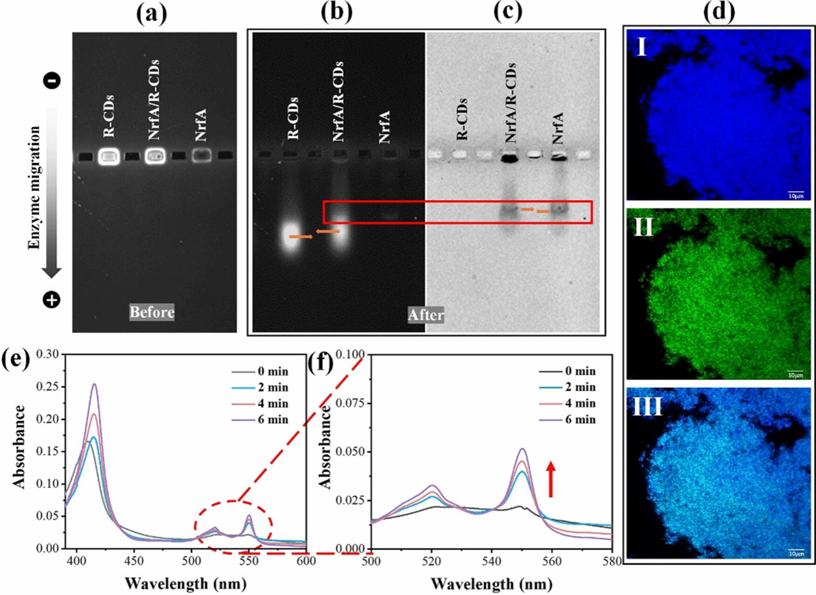 图2 (a, b) R-CDs、NrfA和NrfA/R-CDs复合物在365 nm紫外光下的琼脂糖凝胶电泳图像。(c)经考马斯亮蓝染色后的琼脂糖凝胶电泳图像。(d) NrfA/R-CDs复合物的CLSM图像:(I) R-CDs的荧光图像(Ex 405 nm/Em 440-480 nm);(II) FITC标记的NrfA荧光图像(Ex 488 nm/Em 510-550 nm);(III)上述两幅图像的合并图像。(e, f)光还原后NrfA的紫外-可见吸收光谱
