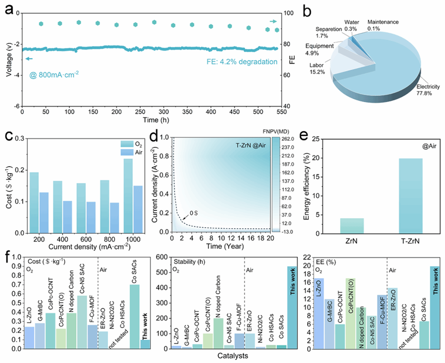 为评估大规模应用潜力,文章从催化剂稳定性、生产成本和能源效率三个方面进行了系统研究。稳定性测试采用自制流动池,并在碳纸上引入疏水扩散层以防止水淹。在空气流和 800 mA·cm-2电流密度下,T-ZrN 可稳定运行长达 540 h,这是迄今在电流密度超过 500 mA·cm-2条件下报道的最长稳定性。技术经济分析结果表明,H2O2的生产成本主要受电力和氧气消耗影响。在空气代替纯氧条件下,成本显著下降。在 800 mA·cm-2时,生产成本低至 $0.10 kg-1。财务净现值 (FNPV) 分析显示,该工艺在空气条件下第一年即可实现 1030 万美元的正 FNPV,并在整个生命周期内增长至 2.685 亿美元,显著优于纯氧条件。T-ZrN 催化剂展现出优异的能效。综合稳定性、经济性与能效等关键指标,T-ZrN 在空气条件下的 2e⁻ ORR 工艺展现出卓越的性能与实际应用前景。