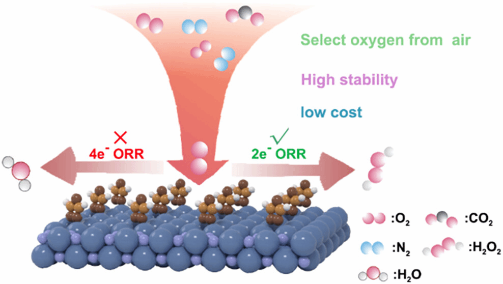 H2O2是一种重要的氧化剂和化工原料,广泛应用于漂白、医疗消毒、精细化学品合成和环境修复等领域。2e- ORR 氧还原制备H2O2是替代当前工业上高能耗高污染蒽醌工艺的有效方式。然而,目前的 2e- ORR反应通常依赖高纯度 O2 (>99.99%) 作为原料,氧气消耗就可能占到总生产成本的三分之一,严重损害了电合成的H2O2经济。开发能够直接利用空气作为氧源的强大催化剂系统至关重要。另外,由于H2O2的腐蚀性,当前催化剂面临高密度电流下稳定运行的挑战。
