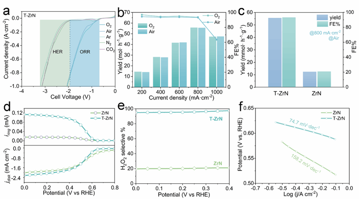 图3 T-ZrN 的 2e- ORR 性能。(a)在 O2、空气、Ar、N2或CO2情况下, T-ZrN 的线性扫描伏安法 (LSV) 曲线。(b)在 O2或空气流动的情况下,不同电流密度下 T-ZrN 的 H2O2产率和 FE。(c)T-ZrN 和 ZrN 的极化曲线。(d)根据 T-ZrN 和 ZrN 的极化曲线计算出的 H2O2选择性。(e)根据 T-ZrN 和 ZrN 的极化曲线计算出的电子转移数。(f)T-ZrN 和 ZrN 的塔菲尔图。