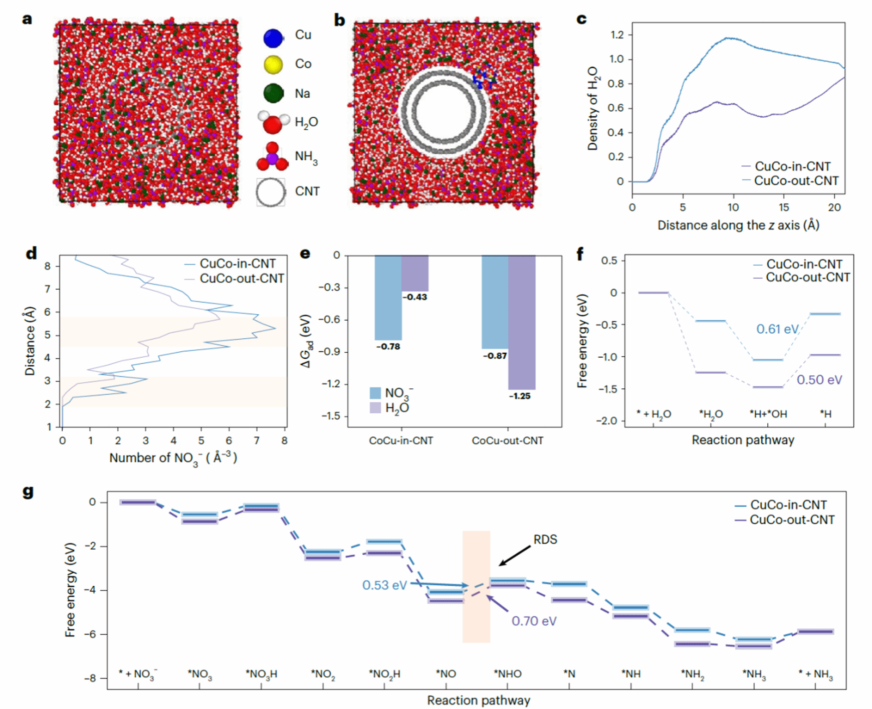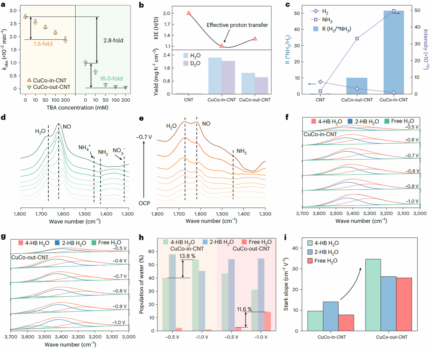 研究团队通过闪蒸焦耳热法方法制备了两类对比样品:一种是CuCo合金纳米颗粒限域于碳纳米管内部的CuCo-in-CNT,另一种是颗粒分布于外表面的CuCo-out-CNT。结构表征结果表明,限域样品中合金颗粒分散更加均匀,并与碳纳米管内壁形成更强的界面相互作用。更为关键的是,这种限域结构带来的并非简单的几何封装,而是深层次的界面效应重构。研究表明,CuCo-in-CNT能够有效降低界面区域水分子的过度富集,同时增强硝酸根在局域界面的吸附与富集,从而构建出一种更加适合 NO₃RR 进行的微环境。在这一环境中,界面氢键网络更加有利于质子的快速迁移,而不再依赖大量表面 H* 的形成,因此析氢副反应被有效抑制。