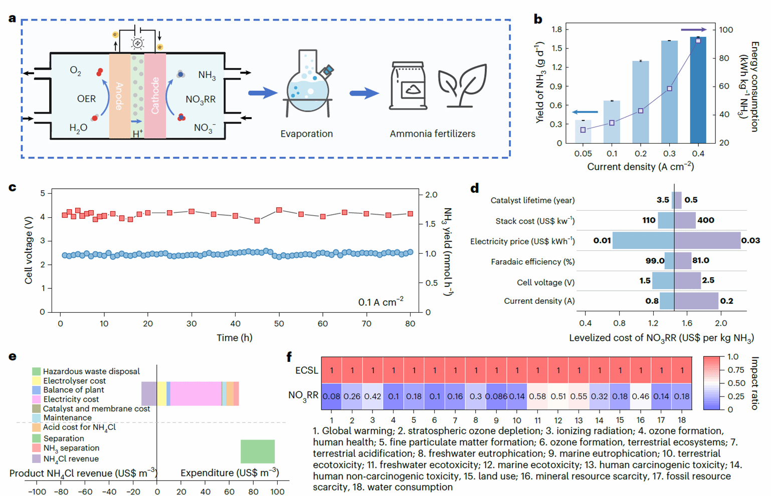 为了进一步验证该体系的实际应用潜力,研究团队将CuCo-in-CNT集成到膜电极组件(MEA)流动反应装置中,对连续硝酸盐还原与氨回收进行了系统评估。结果表明,该体系在较高电流密度下仍能稳定运行。此外,该装置在0.1A cm-2条件下可持续运行超过80 h,氨生成性能依然保持在较高水平。进一步的技术经济分析和生命周期评价显示,相较于传统路线,该电化学处理方案在环境影响与资源化收益方面均展现出明显优势。
