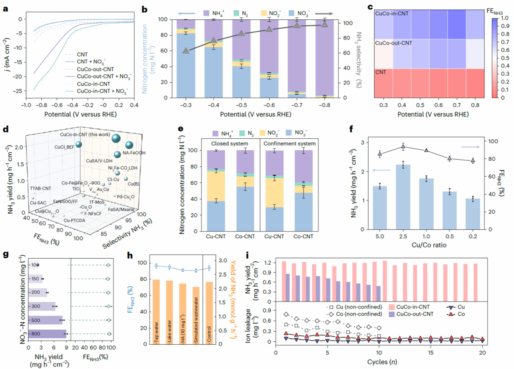 CuCo-in-CNT在氨产率、法拉第效率和氨选择性等方面均显著优于对照样品,并在宽浓度范围与复杂水体中表现稳定。