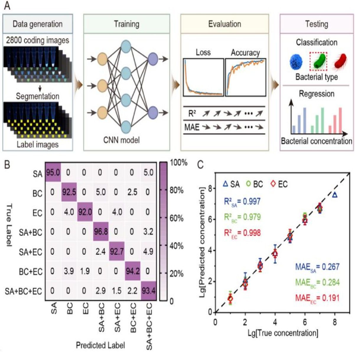深度学习智能解码:基于2800张荧光图像构建并训练卷积神经网络模型,可对智能手机采集的复杂混合荧光信号实现自动化解析,直接输出细菌种类与精确浓度而无需人工判读。