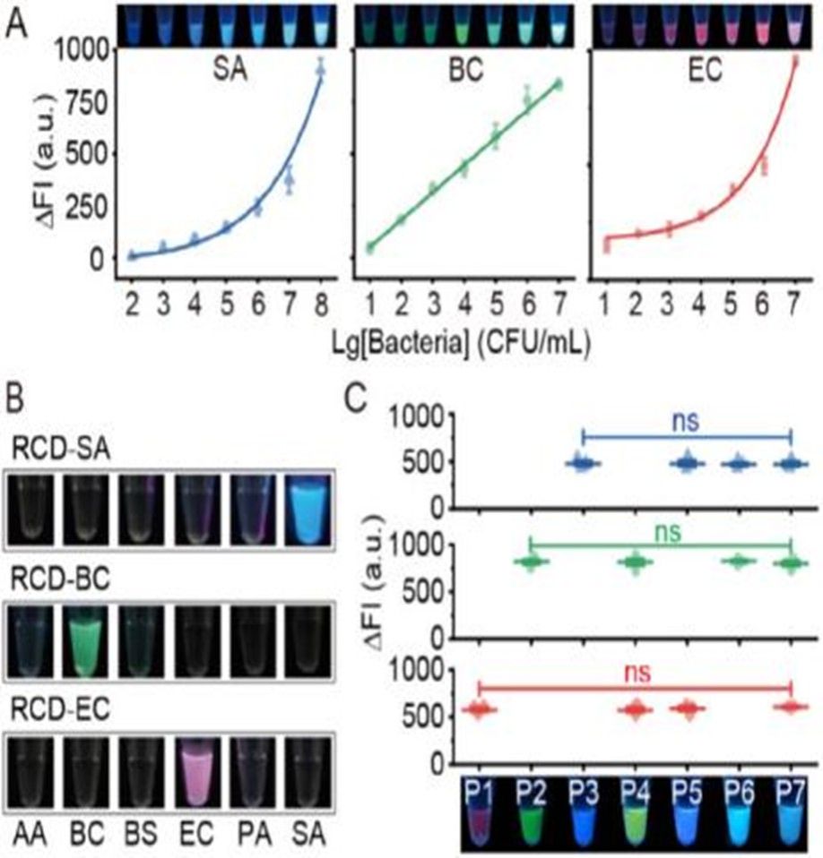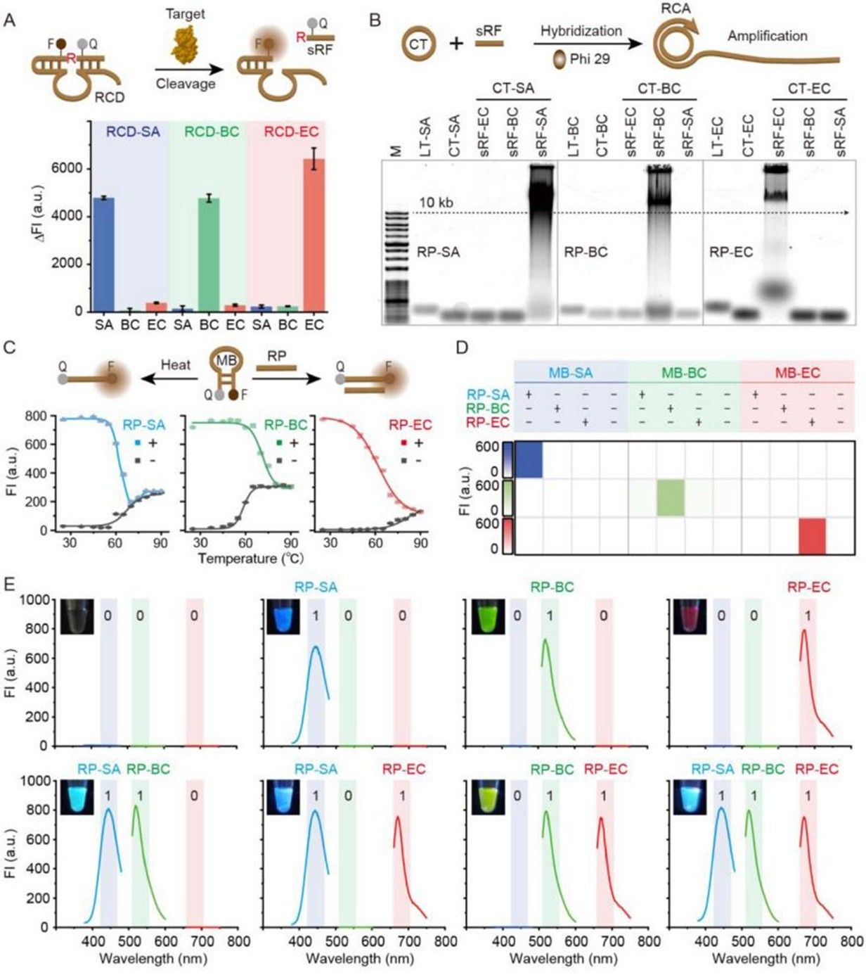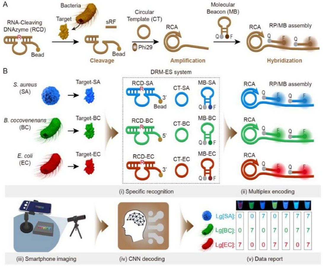 信号放大与颜色编码:经切割后的DNAzyme片段可有效触发滚环扩增(RCA)反应,产生大量串联重复序列,可特异性识别并开启蓝、绿、红三色分子信标,将不同细菌识别事件转化为肉眼可辨、仪器可量化的荧光指纹图谱。