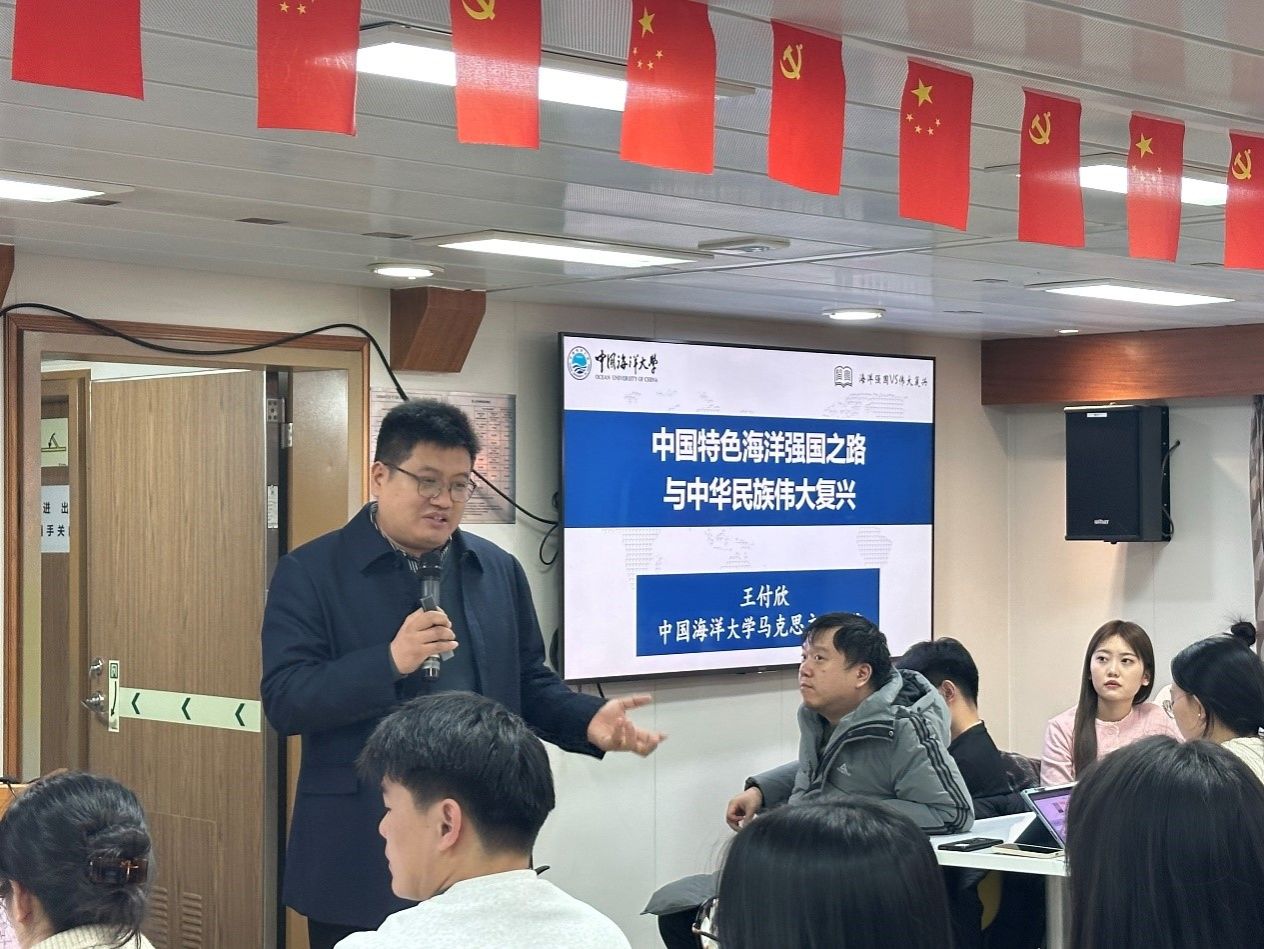 在“东方红3”海上“移动课堂”上,大思政课上的讲授振奋人心。“怎样从思想的变革中探寻中国特色海洋强国之路,实现海洋科技攻关呢?”中国海洋大学马克思主义学院党委副书记王付欣以“建设海洋强国与实现伟大复兴”为题,深入浅出地诠释了“建设海洋强国是实现中华民族伟大复兴的重大战略任务”,结合时事热点,号召同学们以自身专业所长扎实推进海洋强国建设。