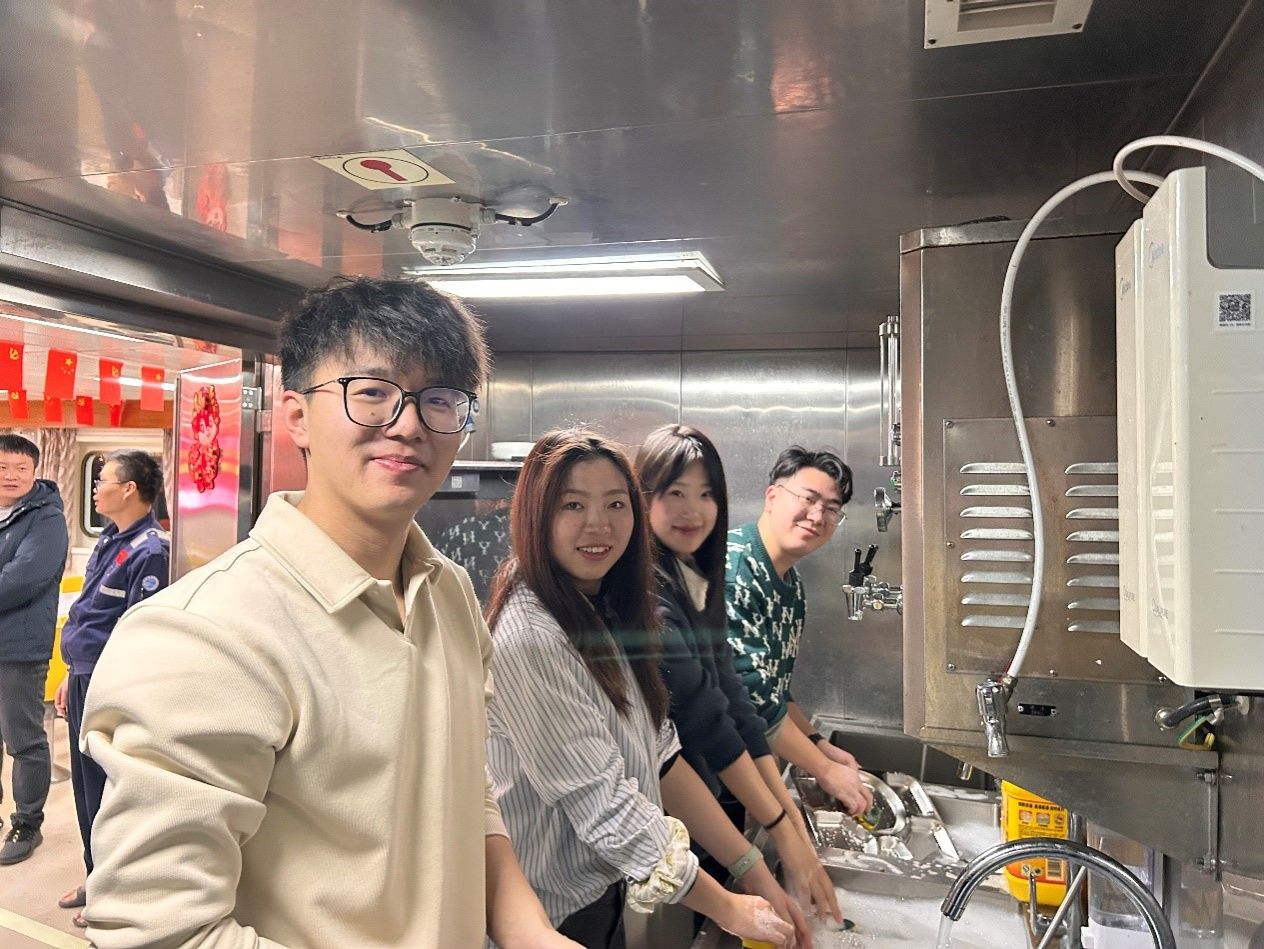 除海洋相关课程外,同学们共同聆听了中国海洋大学新闻中心总编辑李华昌老师讲述图片拍摄基础技能及实践要点,学习海上摄影的构图、光线、角度等,并对特定场景拍摄的注意事项有了初步了解。此外,同学们与全船学生共同参与餐后餐盘清洗、食堂打扫等工作,以劳育美,以美促劳,树立主人翁意识,与美丽海洋“双向奔赴”。
