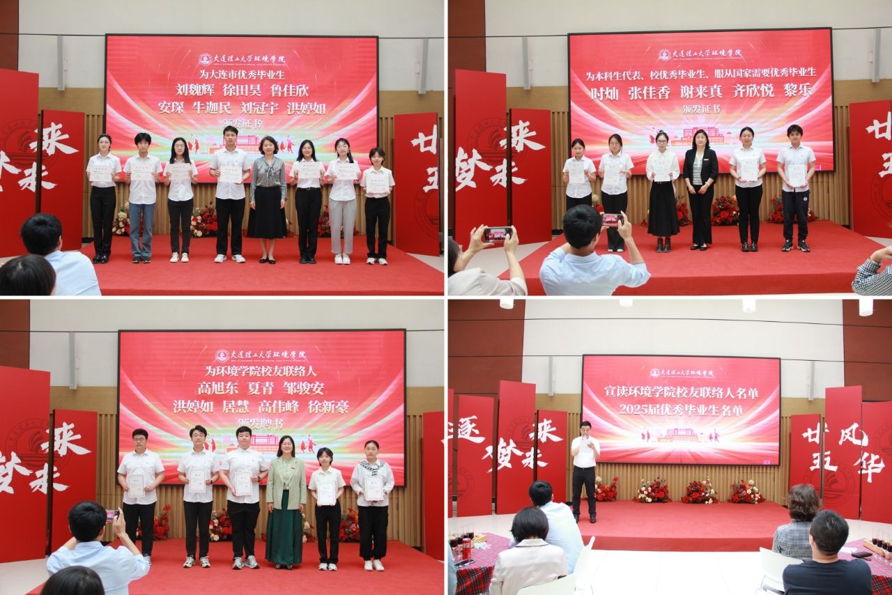 时光荏苒,岁月如歌,活动伊始,一段精心制作的视频带领大家重温了毕业生们在环境学院的青春点滴。视频中那些为梦想拼搏的日子、与同学师长相处的温馨瞬间,仿佛就在眼前,让现场的师生们感慨万千。随后,学院党委副书记兼副院长窦智宣读环境学院校友联络人及2025届优秀毕业生名单。学院党委书记孟秀丽、副院长金若菲、副院长刘薇分别为辽宁省优秀毕业生、大连市优秀毕业生、大连理工大学优秀毕业生、服从国家需要优秀毕业生及校友联络人代表颁发证书。